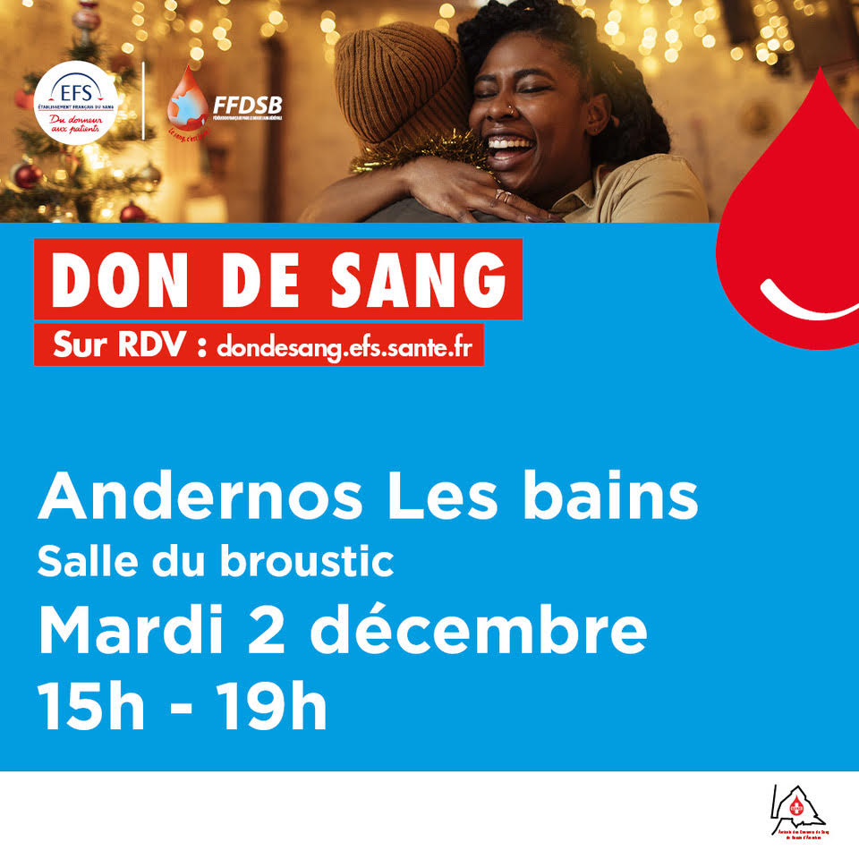 Collecte de sang - De 15h à 19h, Salle du BrousticEn cette période de préparatifs des fêtes, offrez un cadeau unique et précieux : votre sang, un don qui réchauffera les cœurs et sauve des vies !Météo du sang : Actuellement le niveau des réserves de sang est fragile pour le groupe sanguin O, alors nous comptons sur votre belle mobilisation !Pouvez-vous SVP partager largement ce message (partenaires, collaborateurs, proches par mail, écran digitaux, réseaux sociaux…pour soutenir les malades ?Pour plus d’infos : Accueil | Etablissement francais du sang