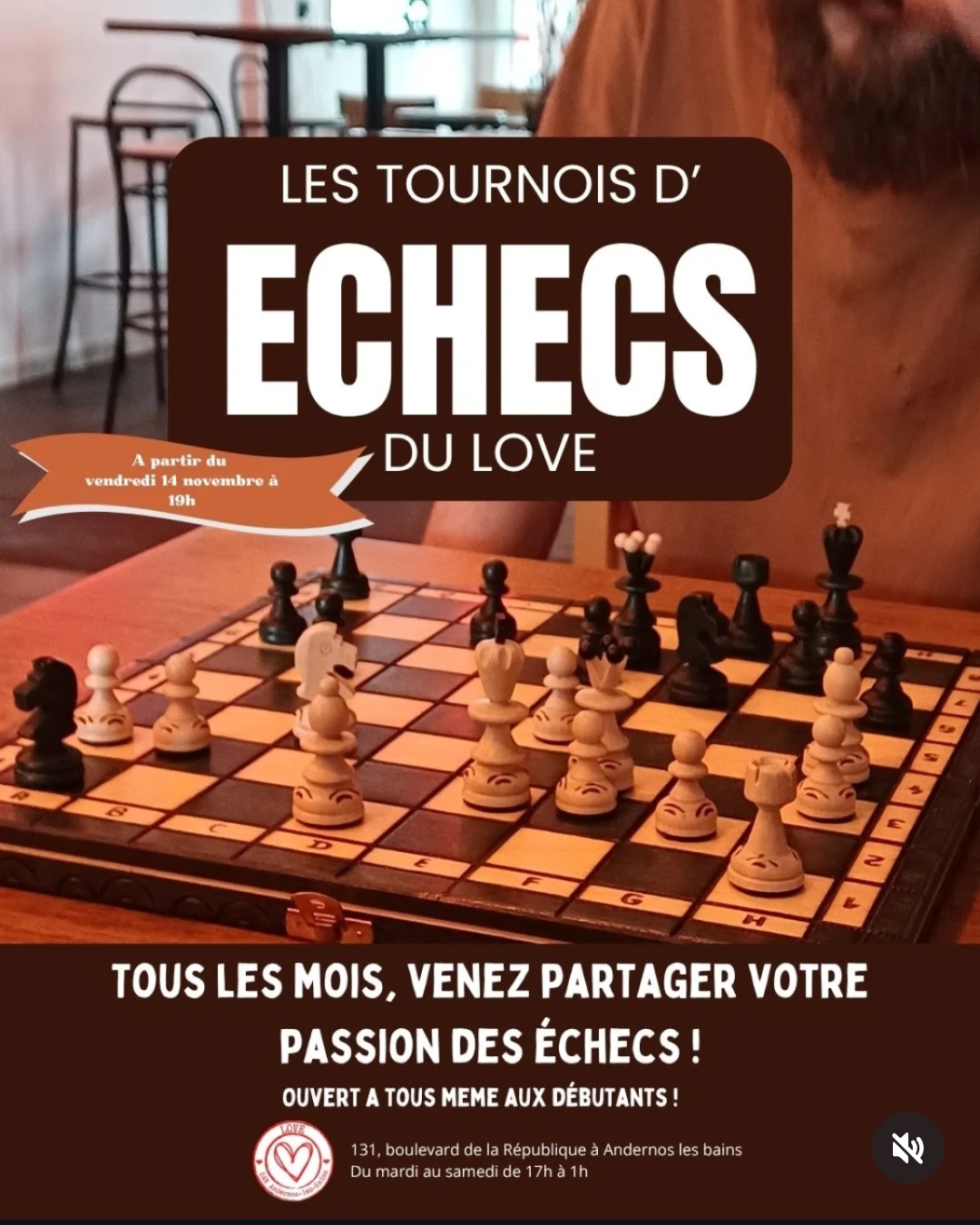 Ouvert à tous et à tous les niveaux, retrouvez chaque mois autour de l'échiquier amateurs ou joueurs accomplis pour vous affronter ou tout simplement vous entraîner dans.un cadre chaleureux.Entrée libre