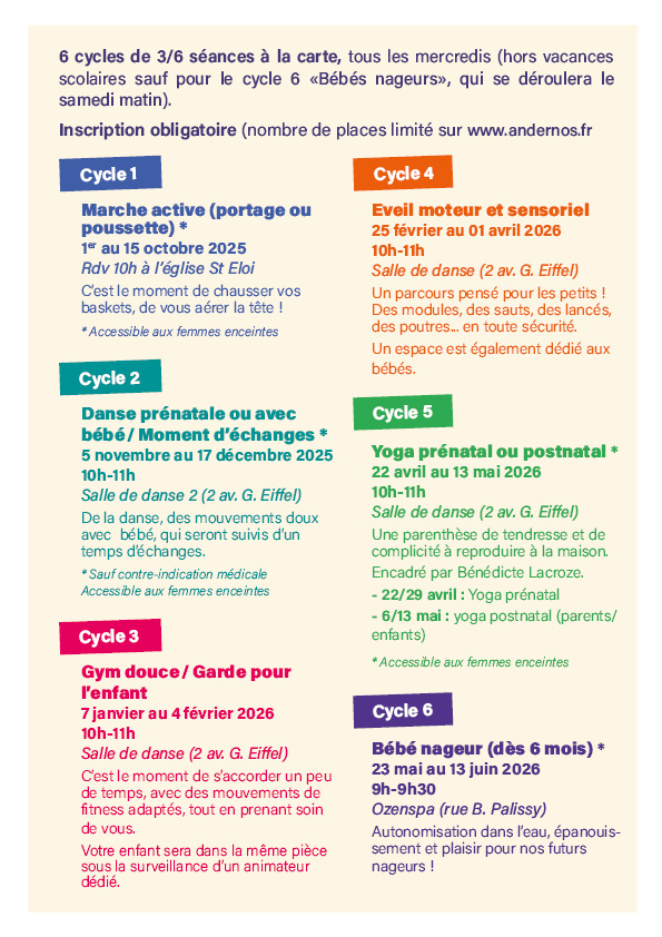→Tarif : 2€ la séance. Les familles intéressées peuvent s’inscrire pour une séance de leur choix ou le cycle complet.