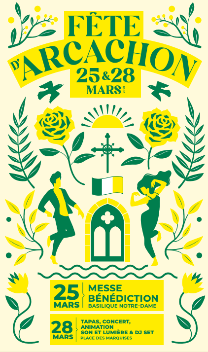Le 25 mars est le jour de l’Annonciation et de la Fête Patronale de la Ville d’Arcachon. Pour le célébrer, une cérémonie religieuse est donnée en la Basilique Notre-Dame d’Arcachon suivie d’une procession fleurie de jaune, jusqu’à la jetée de La Chapelle et sa Croix des Marins. Ce moment solennel empli d’émotion célèbre les origines d’Arcachon tout en honorant la mémoire des marins péris en mer et de leurs familles.