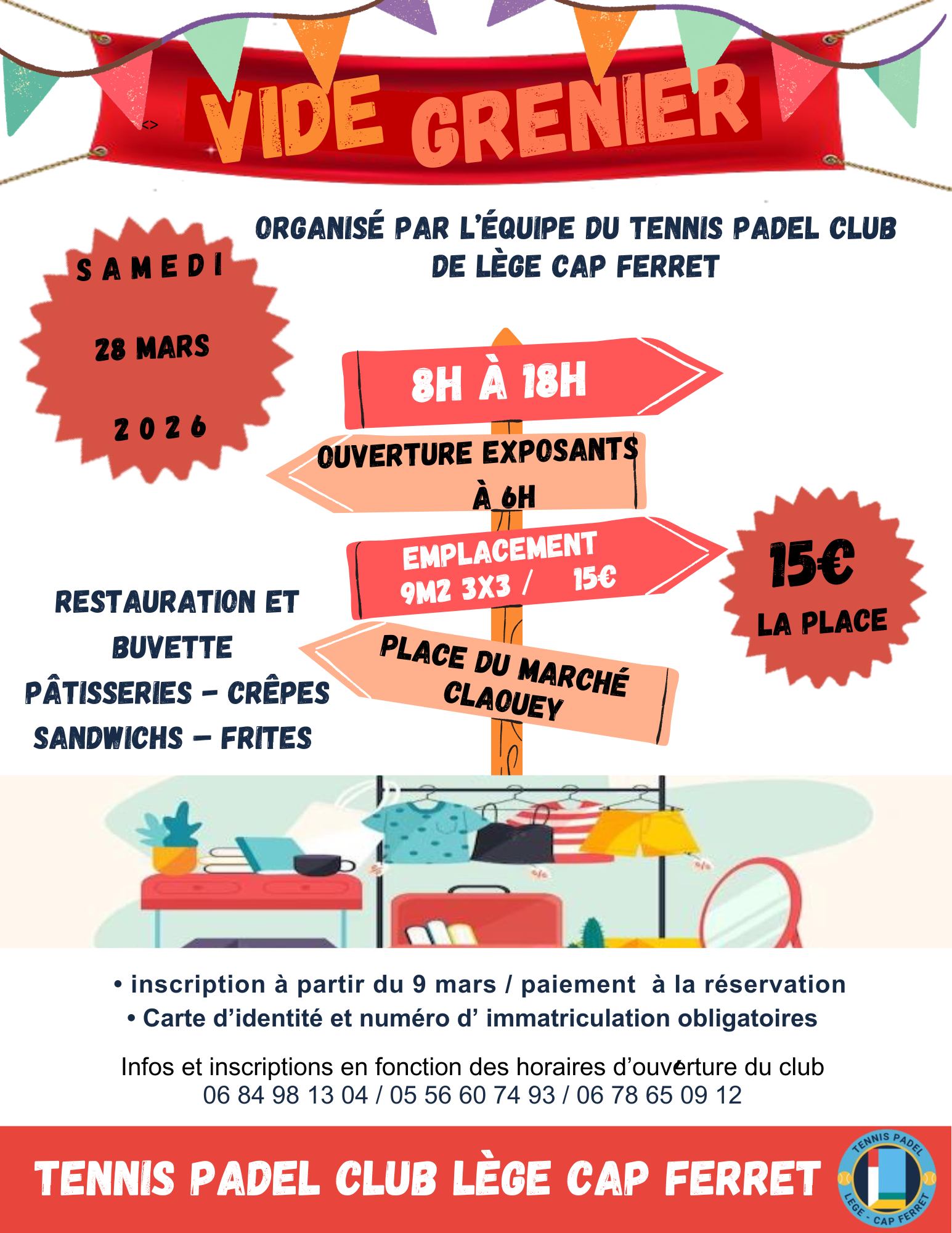 Le traditionnel vide grenier printanier du Tennis Club Lège Cap Ferret aura lieu le samedi 28 mars 2026 de 8h à 18h sur la place du marché de Claouey.