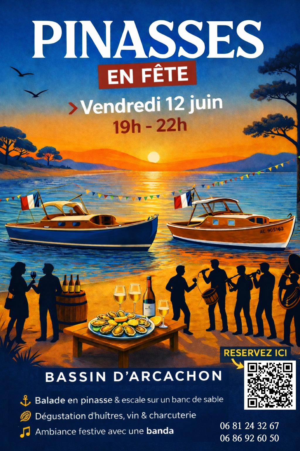 - Départ du port d'Arcachon pour une balade animée par les bandas landaises pour découvrir les cabanes Tchanquées, l'île aux oiseaux , la cote Arcachonnaise. Arret prévu sur un banc de sable pour une dégustation d'huitres , charcuteries et bien sur du vin pour acccompagner tout ça. Et pour finir admirer le coucher du soleil